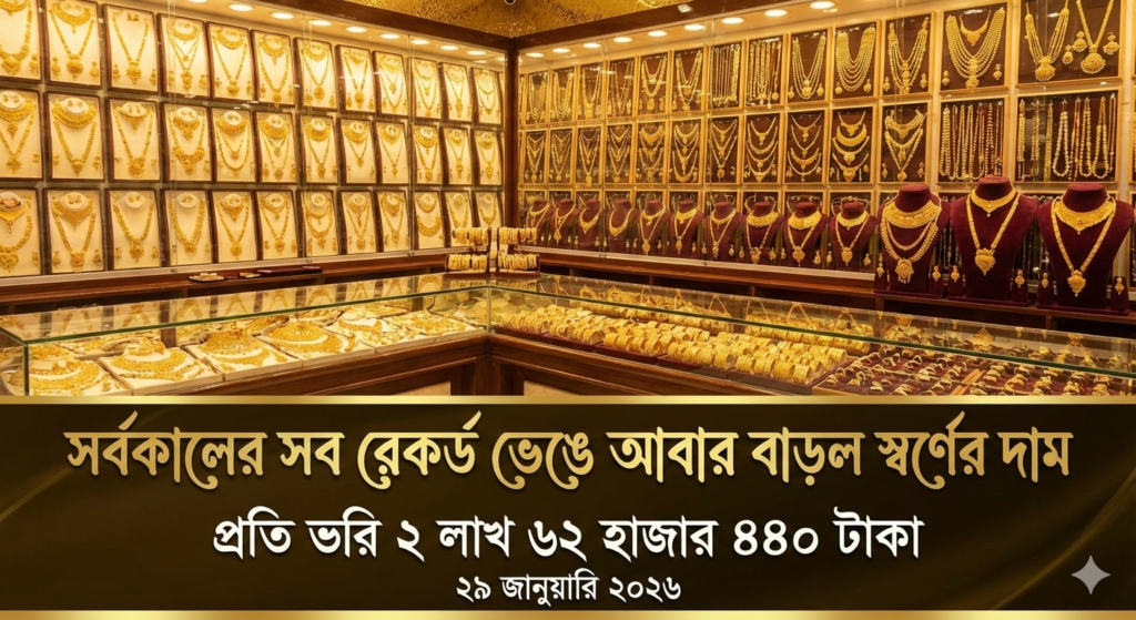 বাজারে নতুন ইতিহাস: প্রতি ভরি ২ লক্ষ ৬২ হাজার টাকা ছাড়াল। বাংলাদেশের স্বর্ণের বাজারে আজ এক অভূতপূর্ব এবং ঐতিহাসিক মুহূর্ত তৈরি হয়েছে। ২৯ জানুয়ারি ২০২৬ তারিখে স্বর্ণের দাম অতীতের সকল রেকর্ড ভেঙে নতুন উচ্চতায় পৌঁছেছে। বর্তমানে প্রতি ভরি (১১.৬৬৪ গ্রাম) ভালো মানের অর্থাৎ ২২ ক্যারেট স্বর্ণের মূল্য দাঁড়িয়েছে ২ লক্ষ ৬২ হাজার ৪৪০ টাকা।বাজার বিশ্লেষকদের মতে, আন্তর্জাতিক বাজারে স্বর্ণের ক্রমাগত মূল্যবৃদ্ধি এবং বৈশ্বিক অর্থনীতির অস্থিরতাই দেশের বাজারে এই অস্বাভাবিক দামের প্রধান কারণ। এছাড়া স্থানীয় বাজারে সরবরাহ সংকট এবং ডলারের বিপরীতে টাকার মানের পরিবর্তনও এই রেকর্ড ব্রেকিং বৃদ্ধিতে প্রভাব ফেলেছে। গত কয়েক বছর ধরে স্বর্ণের দাম বাড়ার প্রবণতা থাকলেও, দুই লক্ষ টাকার ঘর অতিক্রম করার পর এত দ্রুত তা আড়াই লক্ষের কোটা ছাড়িয়ে যাবে, তা সাধারণ ক্রেতা ও ব্যবসায়ীদের ভাবনার বাইরে ছিল।এই আকাশচুম্বী দামের সরাসরি প্রভাব পড়ছে মধ্যবিত্ত ও নিম্ন-মধ্যবিত্ত পরিবারগুলোর ওপর। বিশেষ করে বিয়ের মৌসুমে যারা স্বর্ণের অলংকার কেনার পরিকল্পনা করেছিলেন, তারা এখন বড় ধরনের দুশ্চিন্তায় পড়েছেন। অতিরিক্ত দামের কারণে অনেকে স্বর্ণ কেনার পরিমাণ কমিয়ে দিচ্ছেন অথবা বিকল্প হিসেবে রূপা বা গোল্ড প্লেটেড অলংকারের দিকে ঝুঁকছেন। জুয়েলারি ব্যবসায়ীরাও আশঙ্কা করছেন যে, দাম এভাবে বাড়তে থাকলে বাজারে ক্রেতা সংকট দেখা দিতে পারে এবং গয়না শিল্পের ওপর নেতিবাচক প্রভাব পড়বে।পরিশেষে, স্বর্ণ এখন কেবল একটি ধাতু বা অলংকার নয়, বরং এটি একটি শক্তিশালী বিনিয়োগের মাধ্যম হিসেবে দাঁড়িয়েছে। তবে সাধারণ মানুষের নাগালের বাইরে চলে যাওয়ায় বিয়ের প্রথা ও উৎসবেও এর প্রভাব দীর্ঘমেয়াদী হওয়ার সম্ভাবনা দেখা দিচ্ছে।