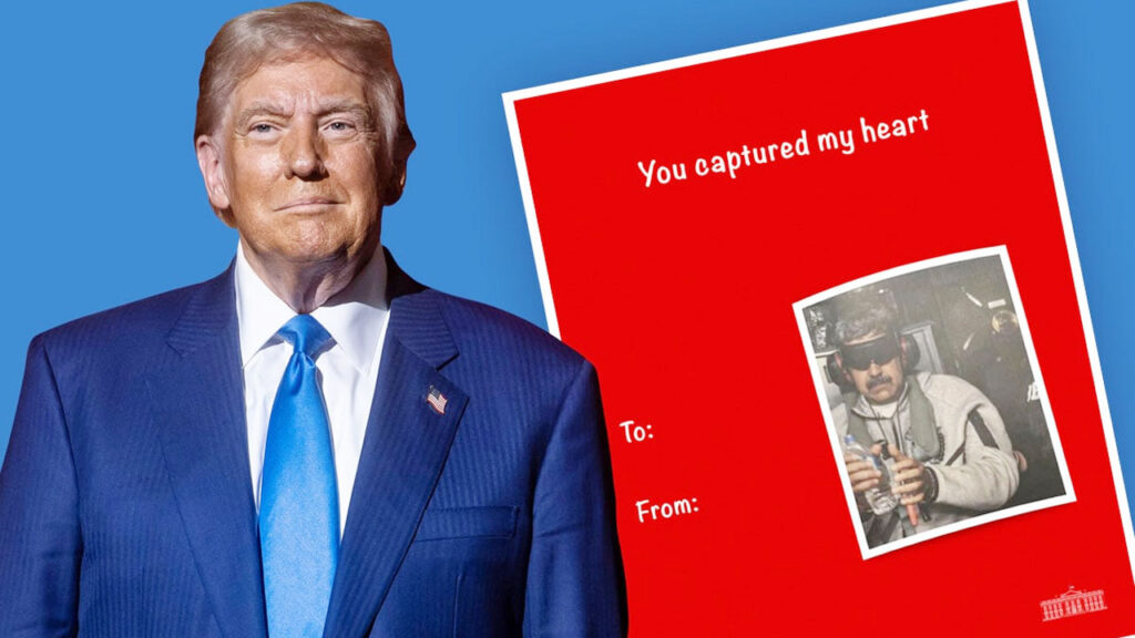 সোমবার কয়েকটি ডিজিটাল কার্ড সামাজিক যোগাযোগমাধ্যম এক্স-এ প্রকাশ করেছে হোয়াইট হাউস। তার একটি কার্ডে ভেনেজুয়েলা থেকে মাদুরোকে নিউইয়র্কে অপহরণ করে আনার সময়কার একটি ছবি দিয়ে বলা হয়েছে, ‘আপনি আমার হৃদয় হরণ করেছেন।’ ছবিটিতে মাদুরোর চোখ ঢাকা এবং হাতে হাতকড়া। কার্ডটির ক্যাপশনে বলা হয়েছে, ‘শুধু আপনার জন্য তৈরি করা।’