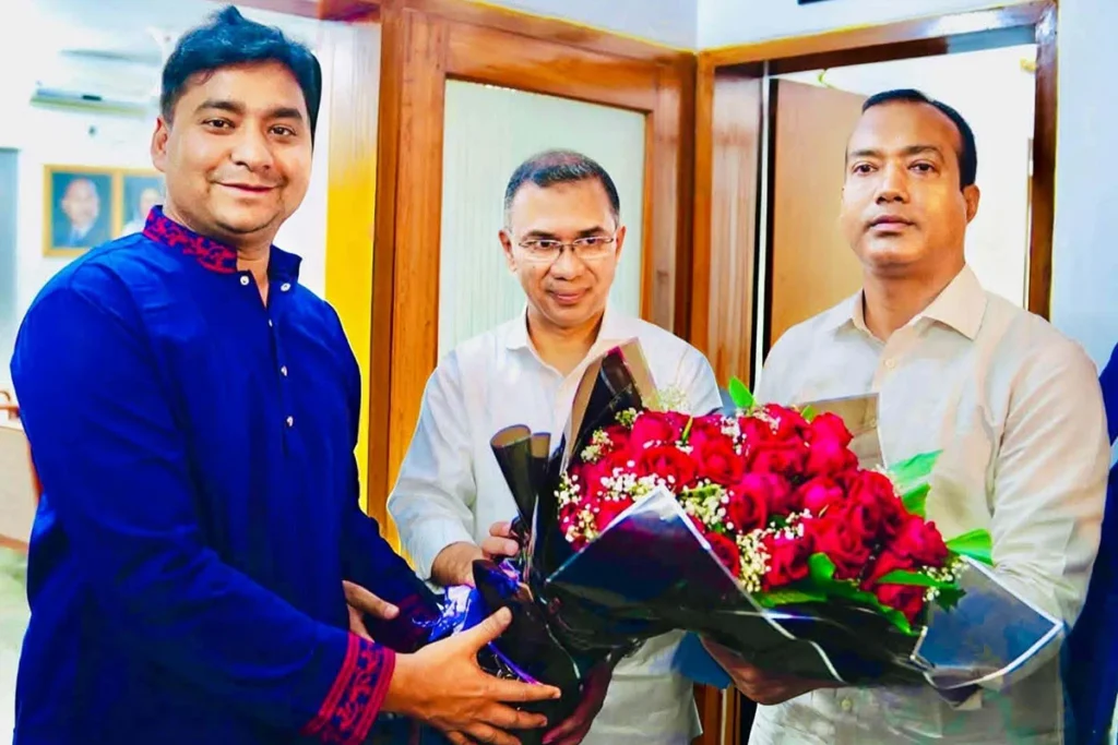 নির্বাচনে জয়লাভ ও প্রধানমন্ত্রী হিসেবে শপথ গ্রহণের ঐতিহাসিক মুহূর্তকে সামনে রেখে বিএনপির চেয়ারম্যান তারেক রহমানকে ফুলেল শুভেচ্ছা জানালেন জাতীয়তাবাদী ছাত্রদলের কেন্দ্রীয় সভাপতি রাকিবুল ইসলাম রাকিব ও সাধারণ সম্পাদক নাছির উদ্দীন নাছির।