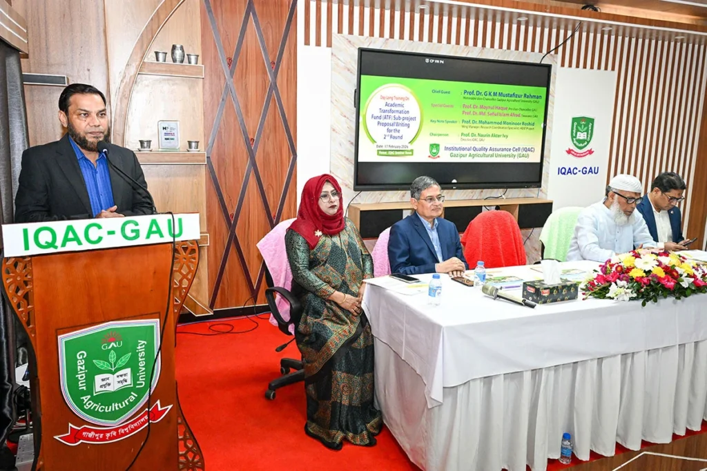 দেশের উচ্চশিক্ষায় গুণগত পরিবর্তন ও উদ্ভাবনের নতুন দিগন্ত উন্মোচনের প্রত্যয়ে গাজীপুর কৃষি বিশ্ববিদ্যালয়ে (গাকৃবি) অনুষ্ঠিত হলো ‘হায়ার এডুকেশন এক্সিলারেশন অ্যান্ড ট্রান্সফরমেশন (হিট) প্রকল্পের দ্বিতীয় পর্যায়ের একাডেমিক ট্রান্সফরমেশন ফান্ড (এটিএফ) উপ-প্রকল্পের প্রস্তাবনা প্রণয়ন’ শীর্ষক এক প্রশিক্ষণ।