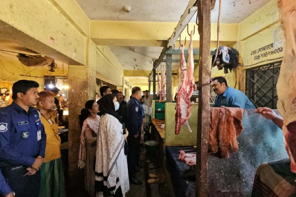 অভিযানকালে বাজারে মাছ-মাংস, কাঁচাবাজার ও মুদি দোকানের পণ্যের মূল্য তালিকা ও পণ্যমান পর্যবেক্ষণ করে বিশেষ টাস্কফোর্স টিম।