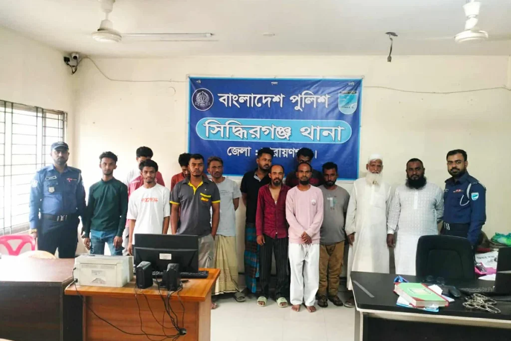 গ্রেফতার ব্যক্তিরা হলেন-মিজমিজি পাগলাবাড়ীর রহিমা বেগম (৫০), উত্তর সানারপাড়ের মনির হোসেন (৪০), ফতুল্লার নাজমুল ইসলাম (৩০) ও ইউসুফ মিয়া (৩৫), গোদনাইল মাঝিপাড়ার জামাল (৪৫), মিজমিজি বাতেনপাড়ার জাকির হোসেন (৪২), সুমিলপাড়ার মুজাহিদ হোসেন (২৮), মিজমিজি দক্ষিণপাড়ার হাজী মোবারক হোসেন (৬৫), রসুলবাগের মানিক মিয়া (৩০), বার্মাশীলের আরাফাত (২২), মাঝিপাড়ার শুভ (৩০) ও আকাশ (২৯), মিজমিজি তালতলার আব্দুল মোতালিব (৭৩), মিজমিজি সিআইখোলার কবির (২৮) ও অন্যান্য মামলায় আরও তিনজন।