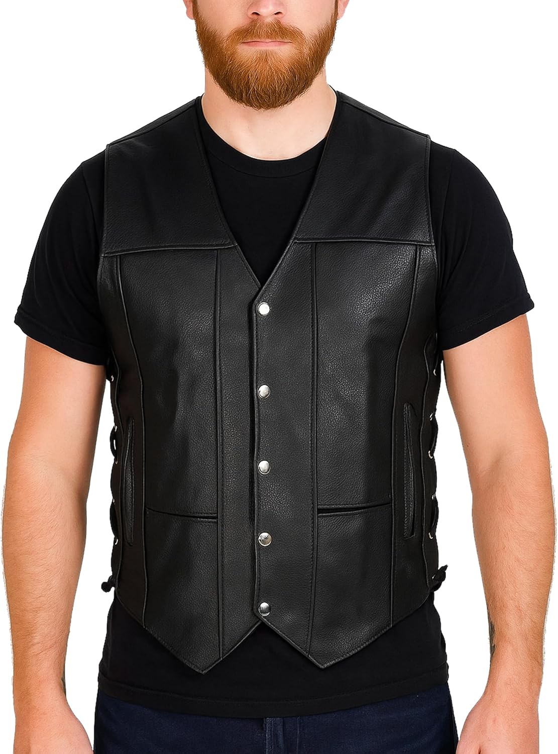 Make sure you check our size chart at the end of the images section and place your order according to it. Mens Motorcycle Vintage Leather Biker Leather Vest / WaistcoatLeather vests are in fashion nowadays and have been providing an appealing treat to people out there. We bring you premium quality genuine leather vests made with high quality material. These mens' studded & plain leather biker vests — are must-have for fans of punk, rock, and gothic fashion. Made from Genuine Leather, this sleeveless motorcycle vest delivers the perfect combination of durability, edge, and attitude. Whether you're hitting the road on your Harle, heading to a concert, or just making a bold statement, this leather vest turns heads and commands attention.Features:Material: Genuine LeatherStyle: Sleeveless Biker VestPockets: Multiple Secure PocketsInside: Soft Viscose Inner Lining Design: Available in Multiple DesignsOccasions: Biker Events, Rock Concerts, Gothic Fashion, Halloween, Cosplay Caring Tips: For longevity of the leather vest. You may wipe the vest with a cloth for daily cleaning. For Occasionally cleaning, we suggest Soft Dry Clean only, Do not wash, bleach or tumble dry.Quality Control: We have a proper QC department where every item is inspected carefully 2-3 times before its dispatch. We have multiple resources for entire operations including manufacturing, packaging and shipping to minimize the risk for the item being late or defective.