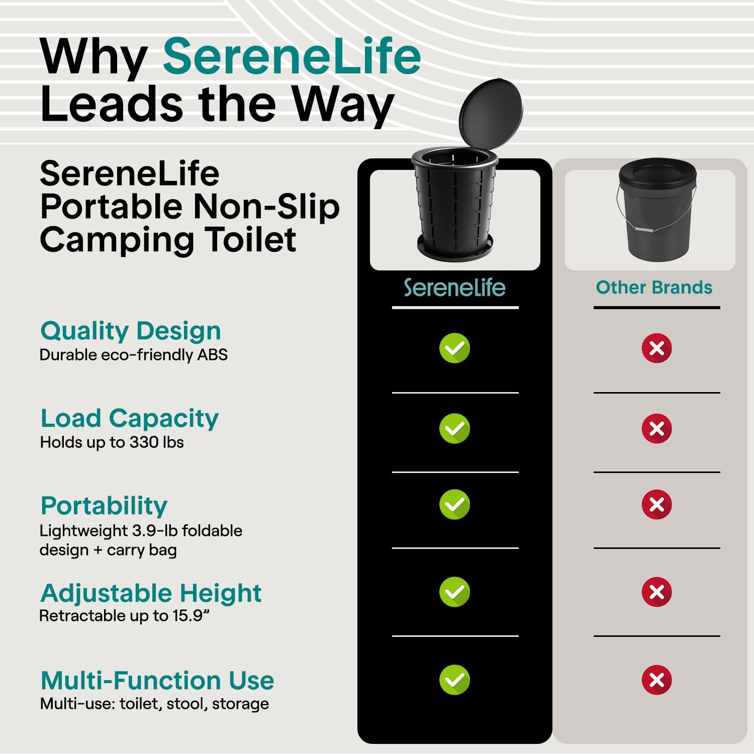 The SereneLife Portable Non-Slip Camping Toilet is your ultimate outdoor companion, designed for convenience and comfort. Ideal for camping, hiking, road trips, and emergency use, this portable toilet for camping offers the perfect solution for your sanitary needs. Crafted from eco-friendly ABS material, this portable toilet features an adjustable seat height, supporting adults up to 330.693 lbs. Whether you're in need of a toilet seat during a camping trip or a portable toilet for adults on the go, this toilet ensures a safe and comfortable experience. Its compact, foldable design makes it easy to store and carry, folding down to just 14.2” x 14.1” x 4.06” inches. The camping toilet expands to 14.2” x 14.1” x 15.9” inches, providing ample space for use. The anti-slip base, along with the locking buckles, guarantees stability and prevents slipping, even on uneven ground. Additionally, this versatile portable toilet for camping doubles as a folding stool, side table, storage box, or even a fishing bucket, making it a multifunctional asset for any outdoor activity. With its simple pull-and-twist setup and included accessories like trash bags and flushable wipes, this portable toilet is both convenient and reliable for your next adventure.