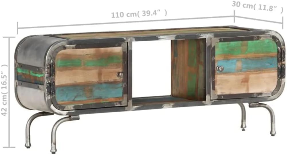 This TV cabinet features a sleek and stylish design, making it a decorative and practical addition to your room decor.Premium material: Solid reclaimed wood consists of reused timbers such as teak, mango wood, pinewood, and beech. These materials are recycled from old buildings such as factories, sheds, and boats. This makes it a very environmentally friendly option in furniture manufacturing. As every piece is handmade and unique colors will vary for each product. You might see some blue, green, and sometimes, orange, red or pink.Stable frame: The iron frame ensures sturdiness and stability and adds to the cabinet's inrial style as well.Practical design: The TV stand has 2 compartments with doors and 1 shelf, providing ample storage space for keeping your multimedia appliances, books and other items well organized and within easy reach. Note:The colors may vary from piece to piece, making each piece unique and slightly different from the next. The delivery is random.Color: MulticolorMaterial: Solid reclaimed wood with a mixed color finish, ironDimensions: 43.3" x 11.8" x 16.5" (W x D x H)Assembly required: Yes